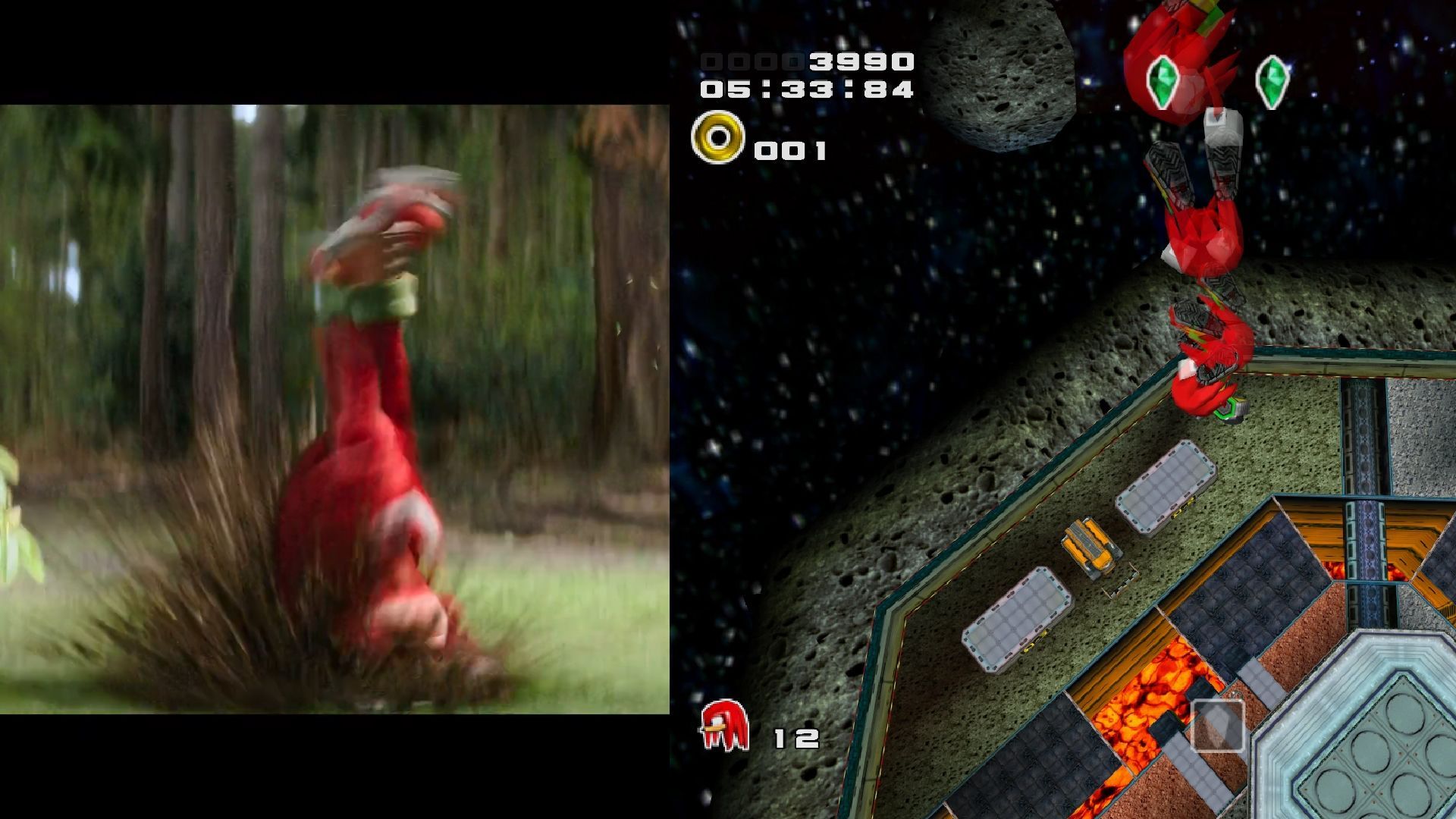 Wade (as Knuckles) has to complete a very small section of a Sonic 2 special stage, complete with bombs and rings and a drop-down START logo. This was really cool, and a fantastic addition.