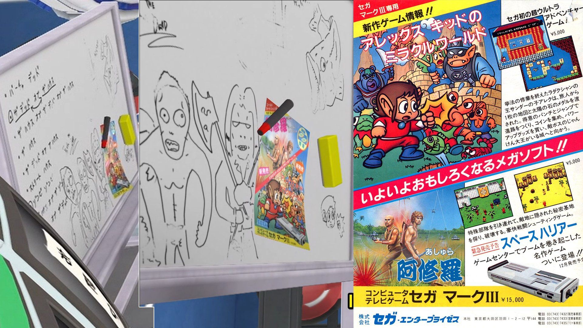 First of all, there's a doodle of Alex Kidd in the bottom right corner of the white board, just his head and hand (with the attacking visual effect). There is also a poster for Alex Kidd in Miracle World twinned with Ashura (Known as Secret Commando in Europe and Rambo: First Blood Part II in America). However I couldn't find the variant actually used in the show. The version I found seems to use the same layout, but things have been shifted and the images shrunk to make way for screenshots and descriptions. I'm not sure where the version in the show comes from, if you know where I could get a higher resolution copy of that version please let me know.