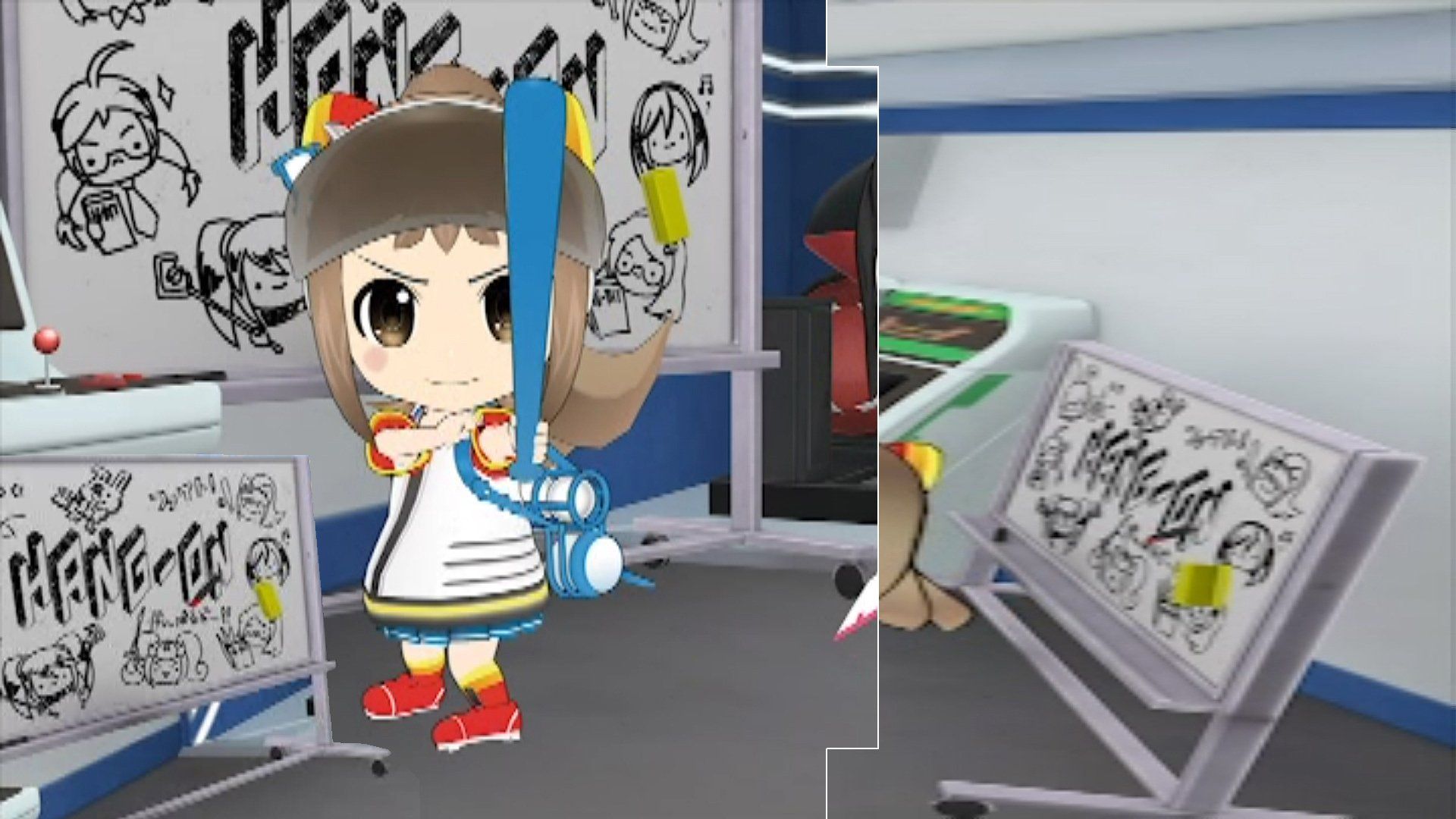 In the top-right corner we have a camera with speakers hanging from the ceiling and below it is an OpaOpa machine facing a monitor displaying Fantasy Zone. This "arcade" setup is purely fictional, which is obvious by it's overly small size and trailing tubing.