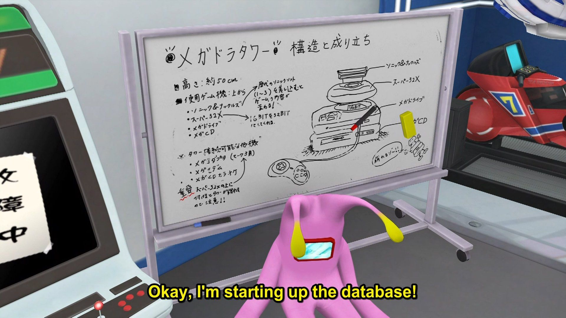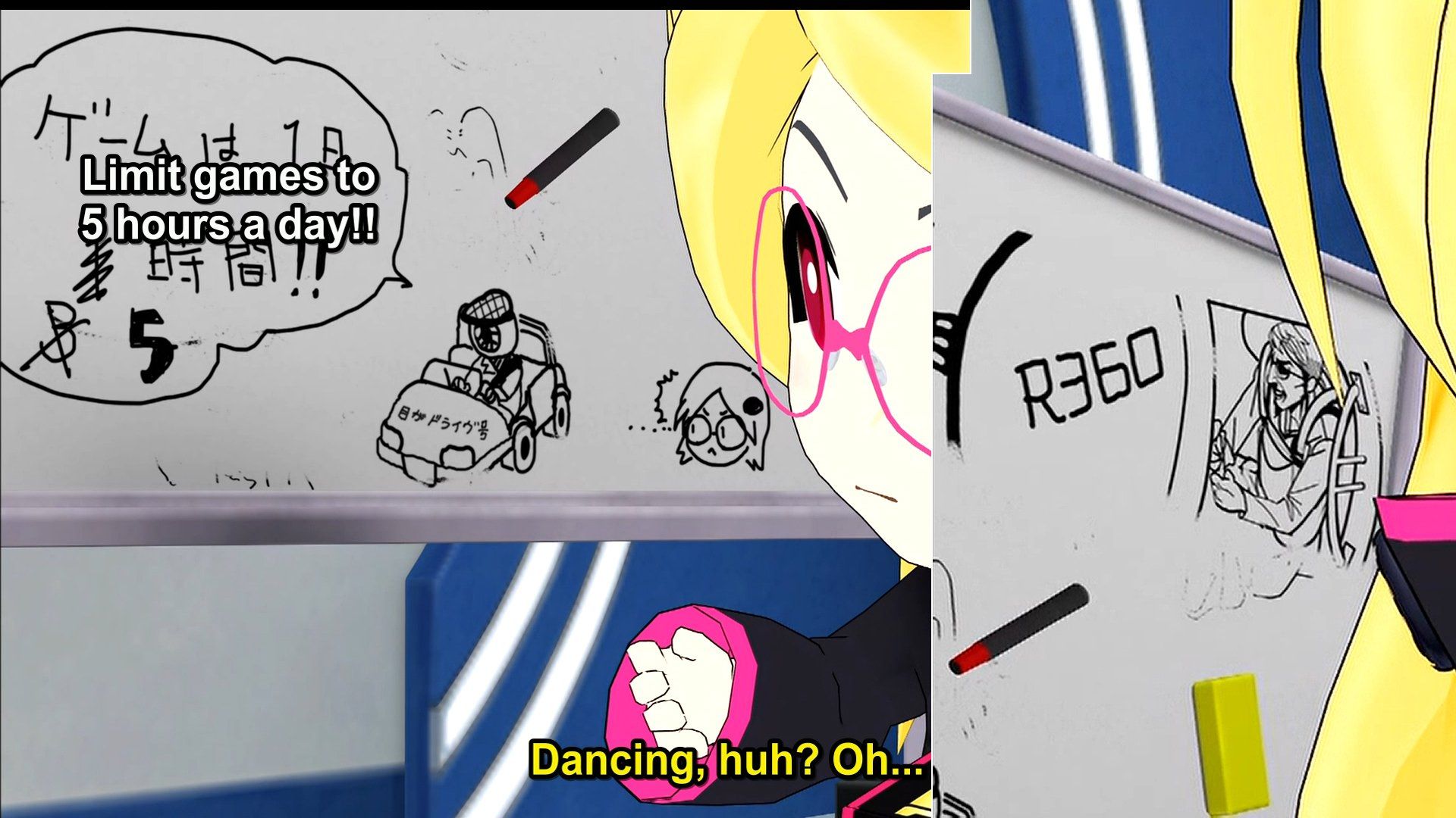In Episode 3, the white board is only seen in two close-ups on Mega Drive - only giving us small pieces of what is on there. Sadly, we never get an overview of it. However the pieces on there include what appears to be an eyeball driving a golf cart telling you to limit your gaming to 5 hours a day. Mega Drive is drawn in chibi form next to this, with a shocked expression on her face.