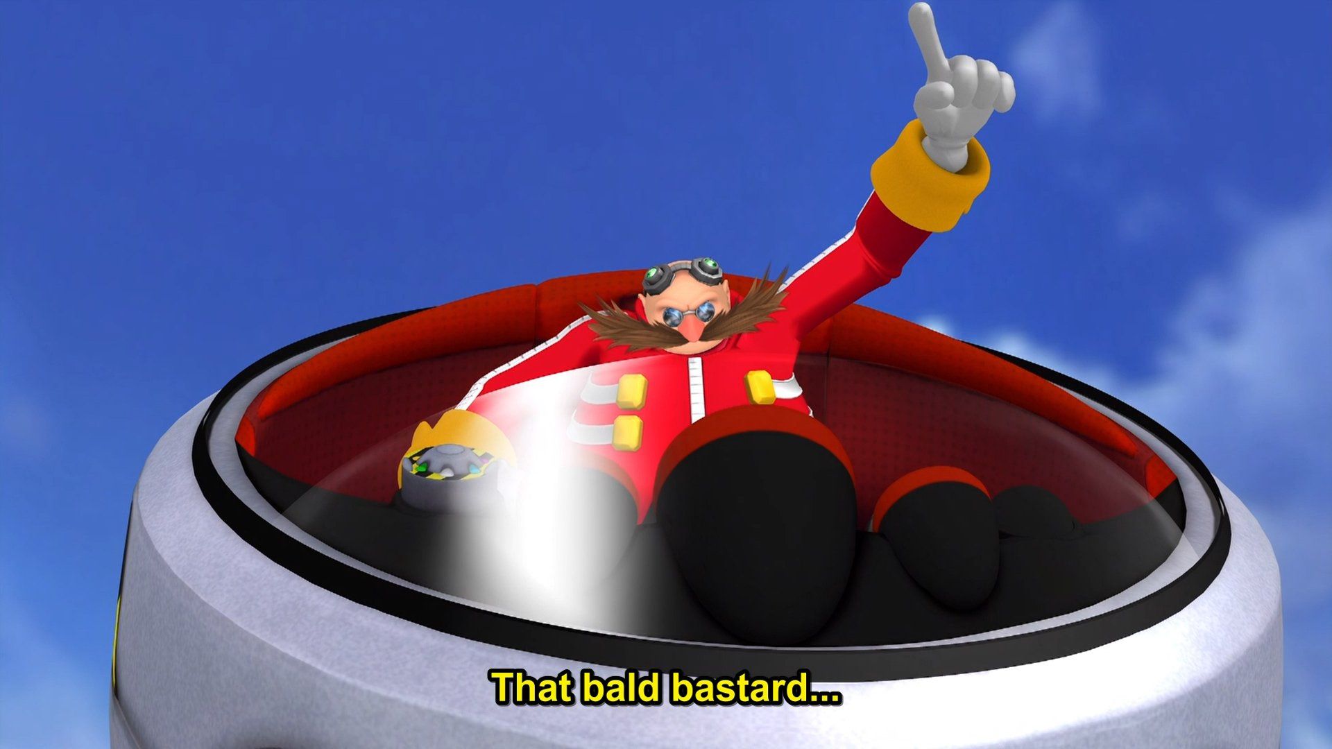 His appearance includes one of the girls shouting "That bald bastard...", which would normally seem too severe for a seemingly child-friendly cartoon. However we have to remember that Japan didn't materialise from Latin, and that certain swear words don't really apply as curses in the Japanese language. Another example of this I've seen is in the Japanese version of Sonic X when someone calls Rouge the Bat a "Bitch".