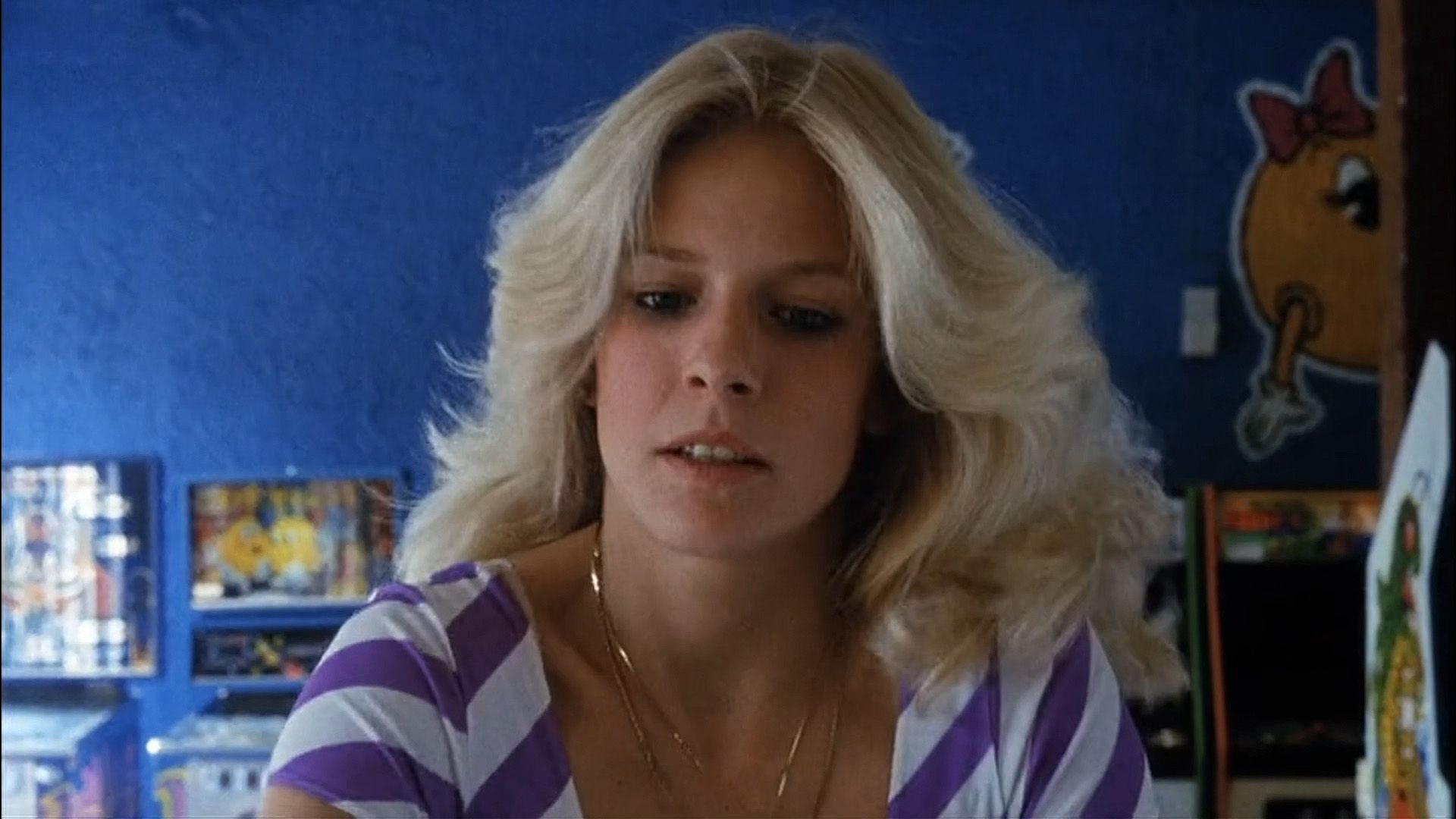 Behind the woman playing we can see a Pac-Man pinball machine to camera left, a Centipede machine to far camera-right and a Ms Pac-Man standee mounted to the wall behind her. When she whips her hair back (which she seems to do more than actually play the game) a pink ghost is seen behind her head.