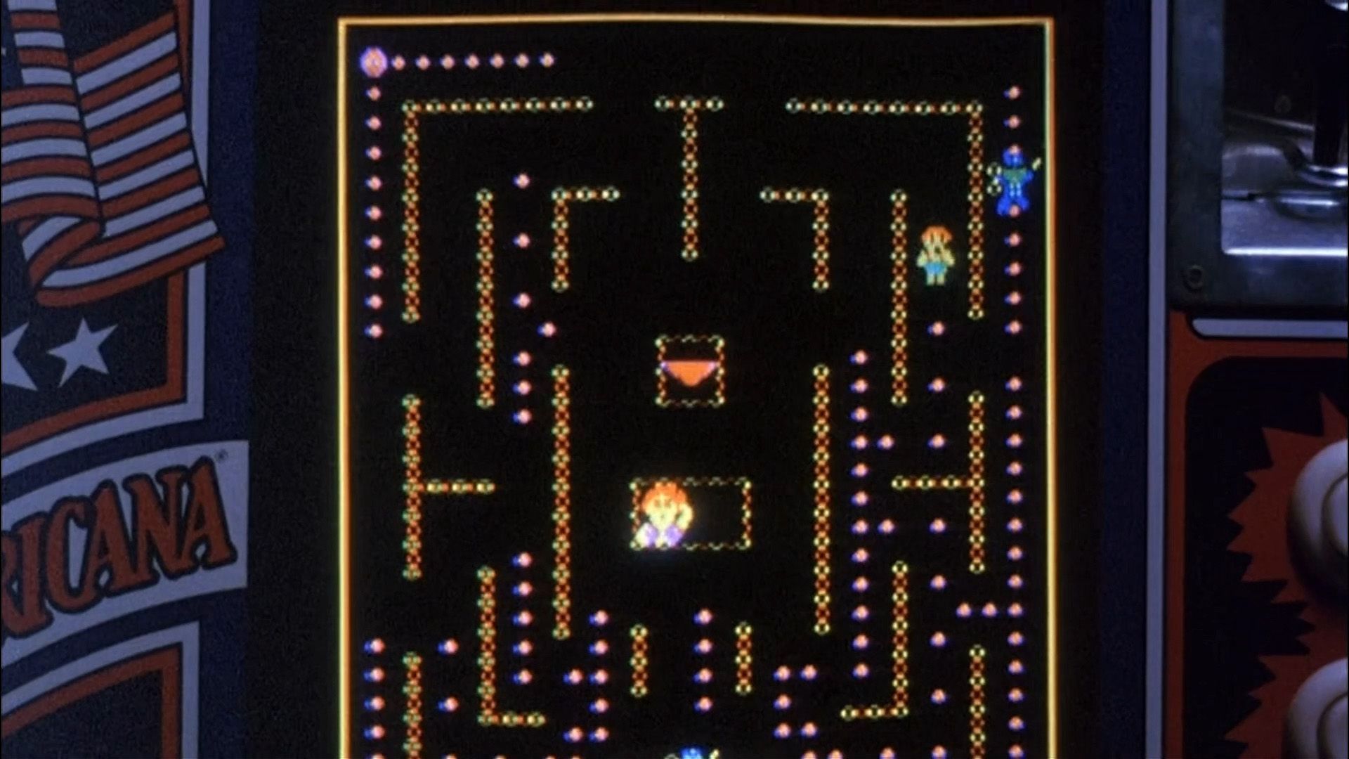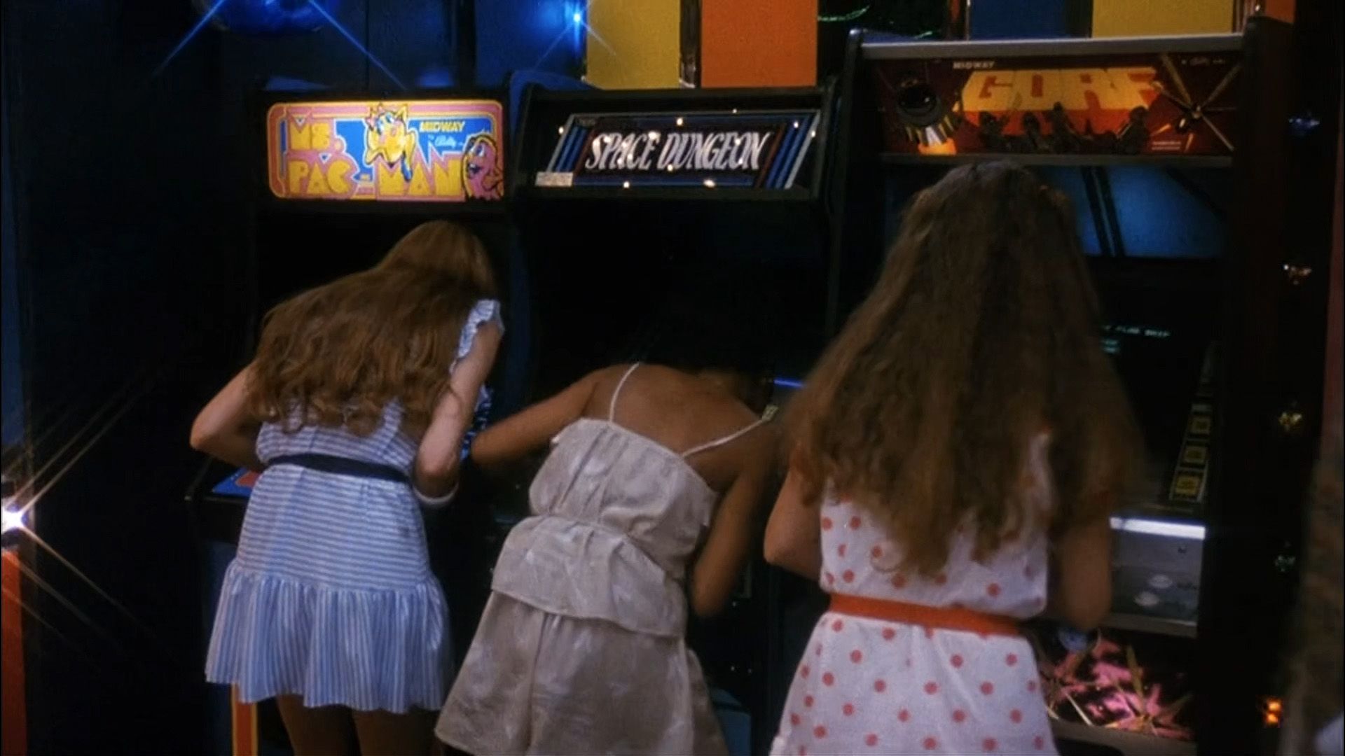 In a shot from behind the girl, we see four arcade cabinets - including the on she is playing. The intro montages footage of her gaming with game footage, she's clearly shown in live action to be playing Solar Fox - but Solar Fox's gameplay never makes an appearance on-screen.