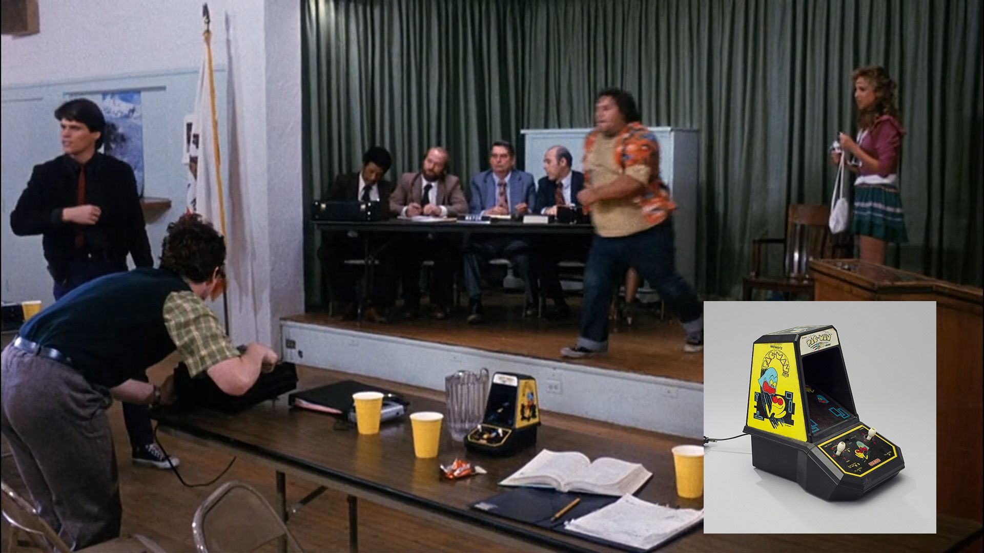 The main character has to train for the finale battle using this portable copy of Pac-Man. It is seen in his bedroom, and briefly in this Mayor "court-room" scene. It is not used here, so it is an odd inclusion, but is used later.