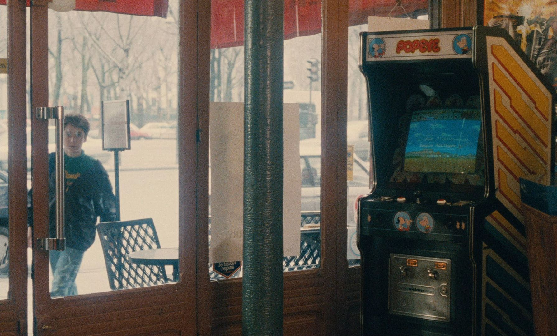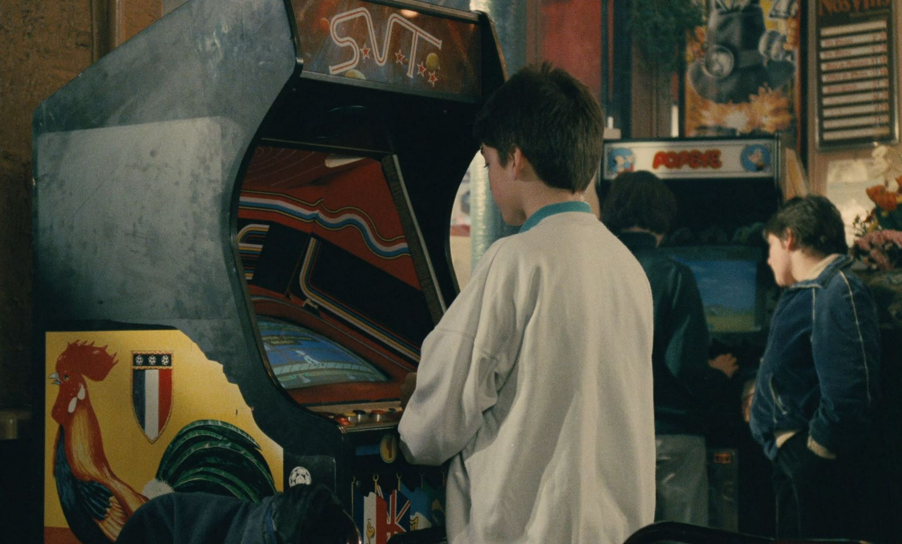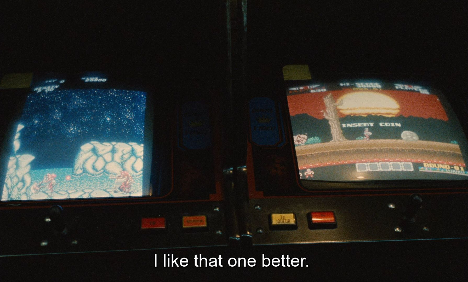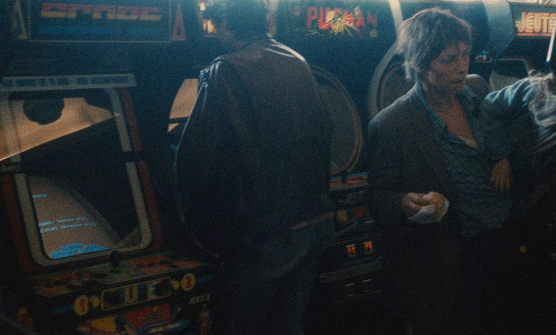 Of more interest is the cabinet behind the main actress. PucMan. That's not a spelling error, and it is what it sounds like. A very early Pac-Man cabinet that still bears the game's original title. I could not find any photos of this cabinet online, the closest was the original West-German release of the game which was named Puck-Man. Because this movie was made in 1988, and filmed in a generic French town, it appears one of these old French cabinets slipped through the net and remained in service - a piece of missing history recorded in this film by pure chance.