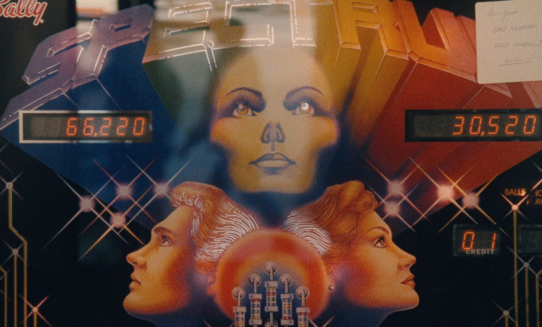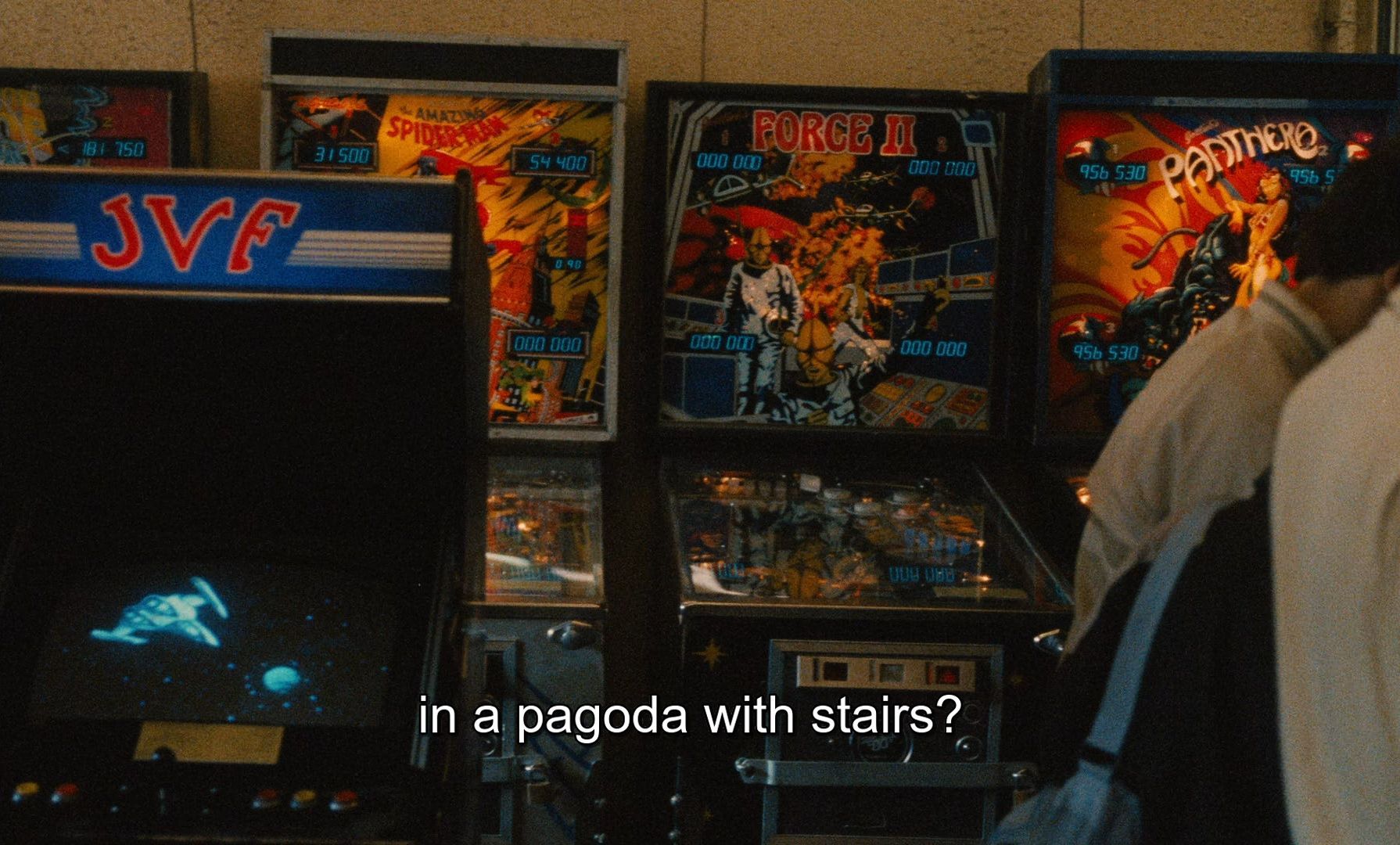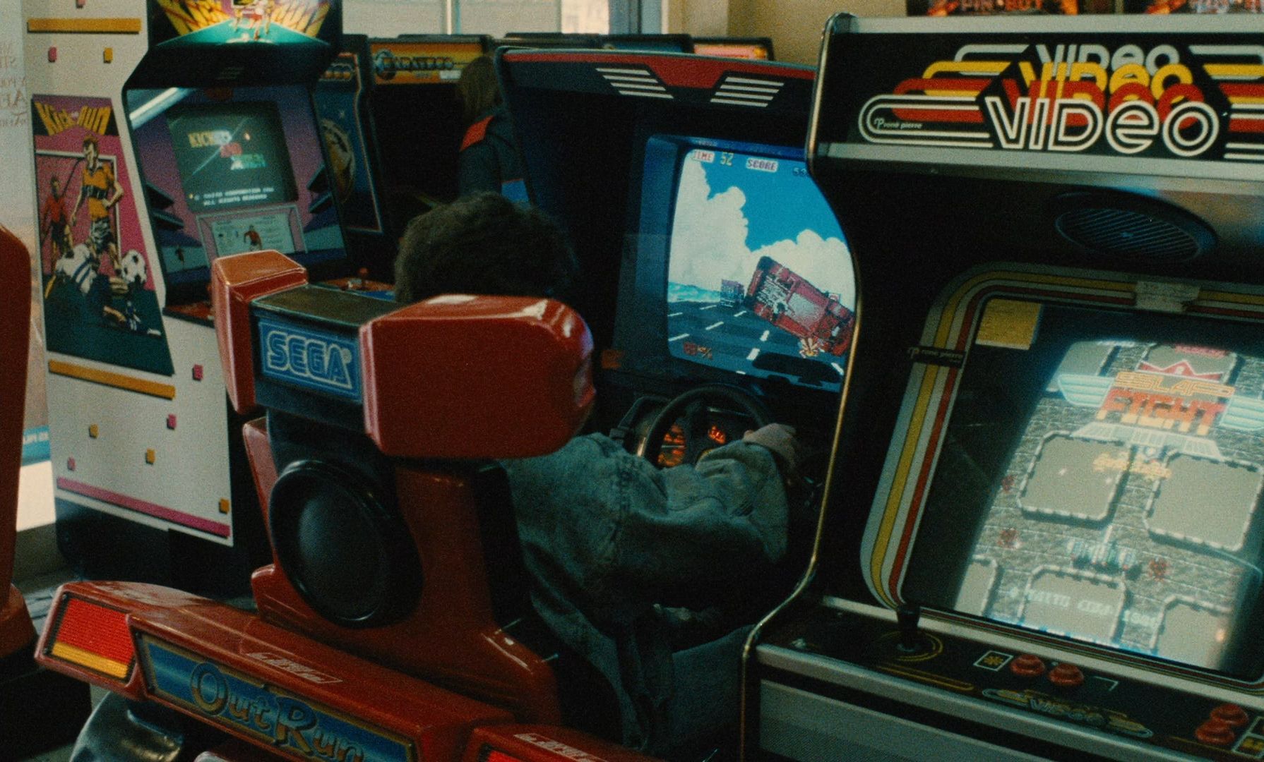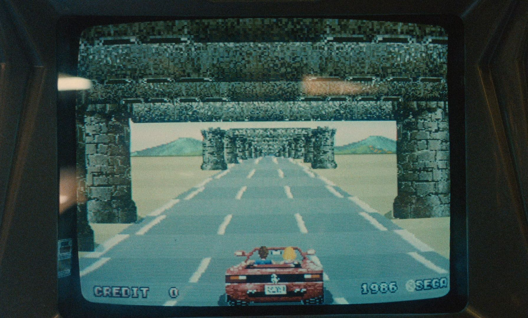 We get a wonderfully clear shot of Outrun's attract mode. Outrun was only released in 1986 and would have been one of the most technologically advanced arcade machines available during the time of filming.