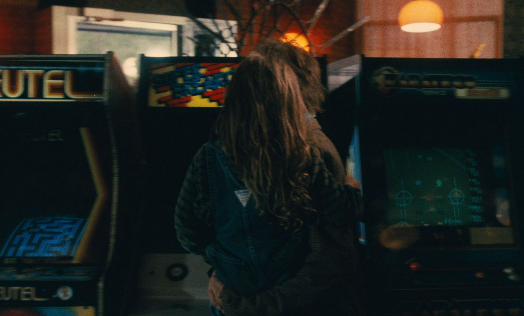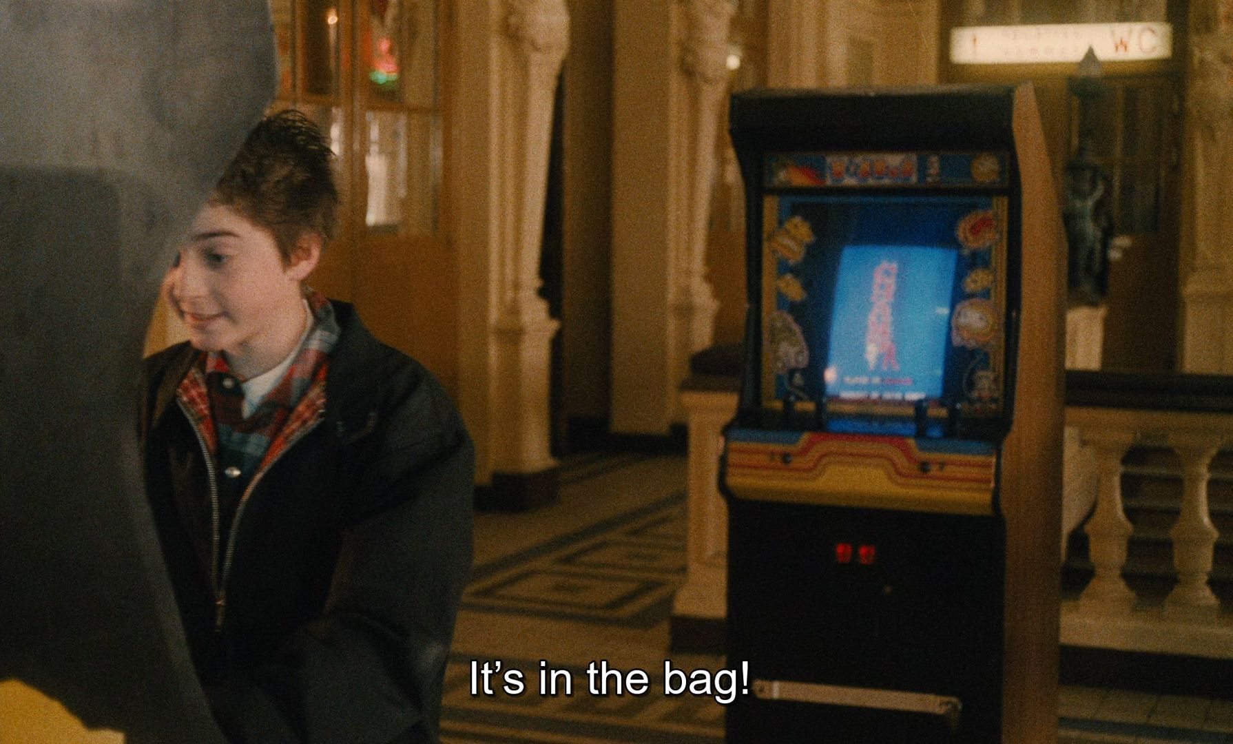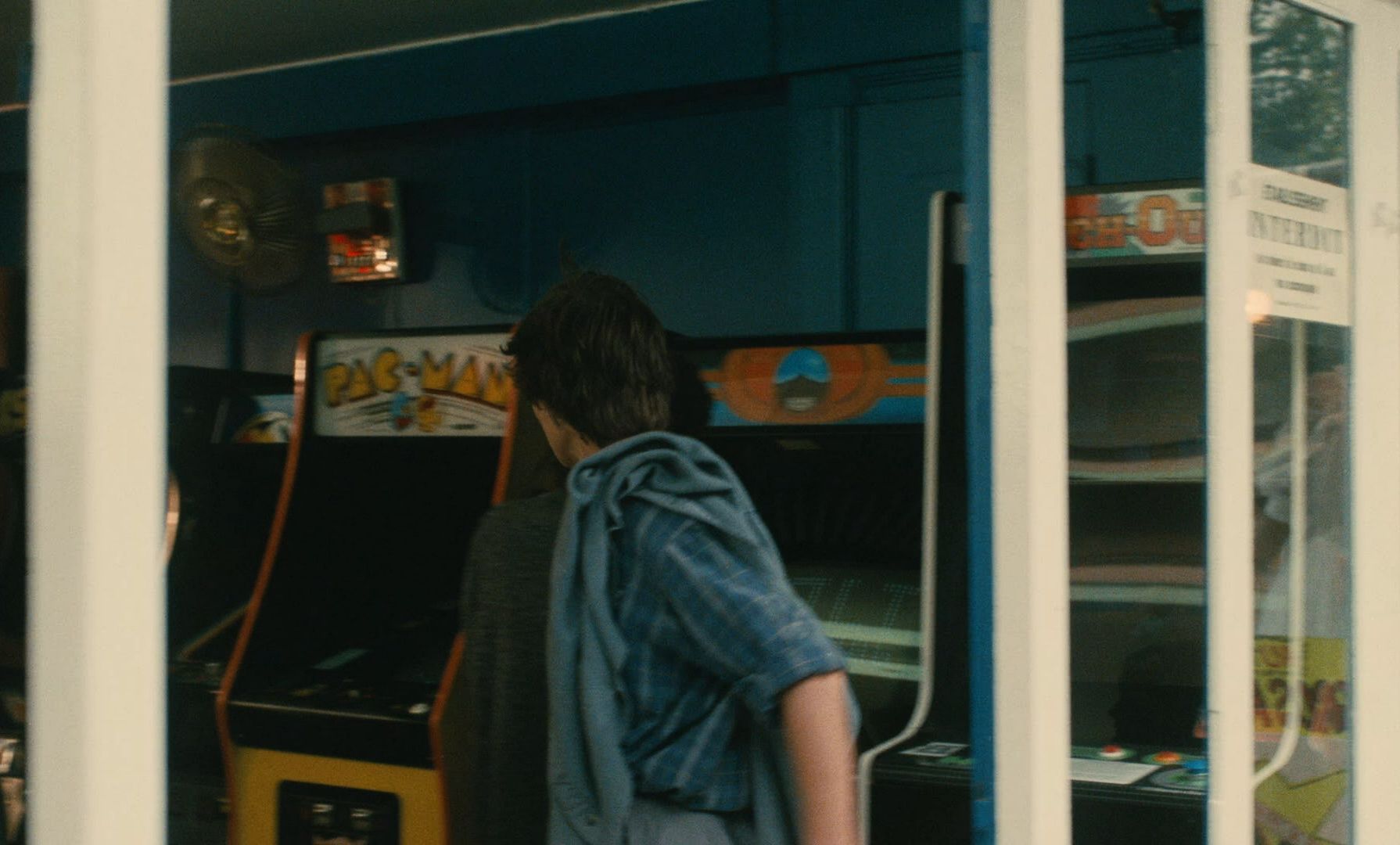 During the arcade montage, we see two cabinets relatively clearly. There's SCORE on the left, which I couldn't find anything about online. The camera never goes higher than this, but I'm assuming Score the second half of a game name, or this is a generic cabinet for other games.