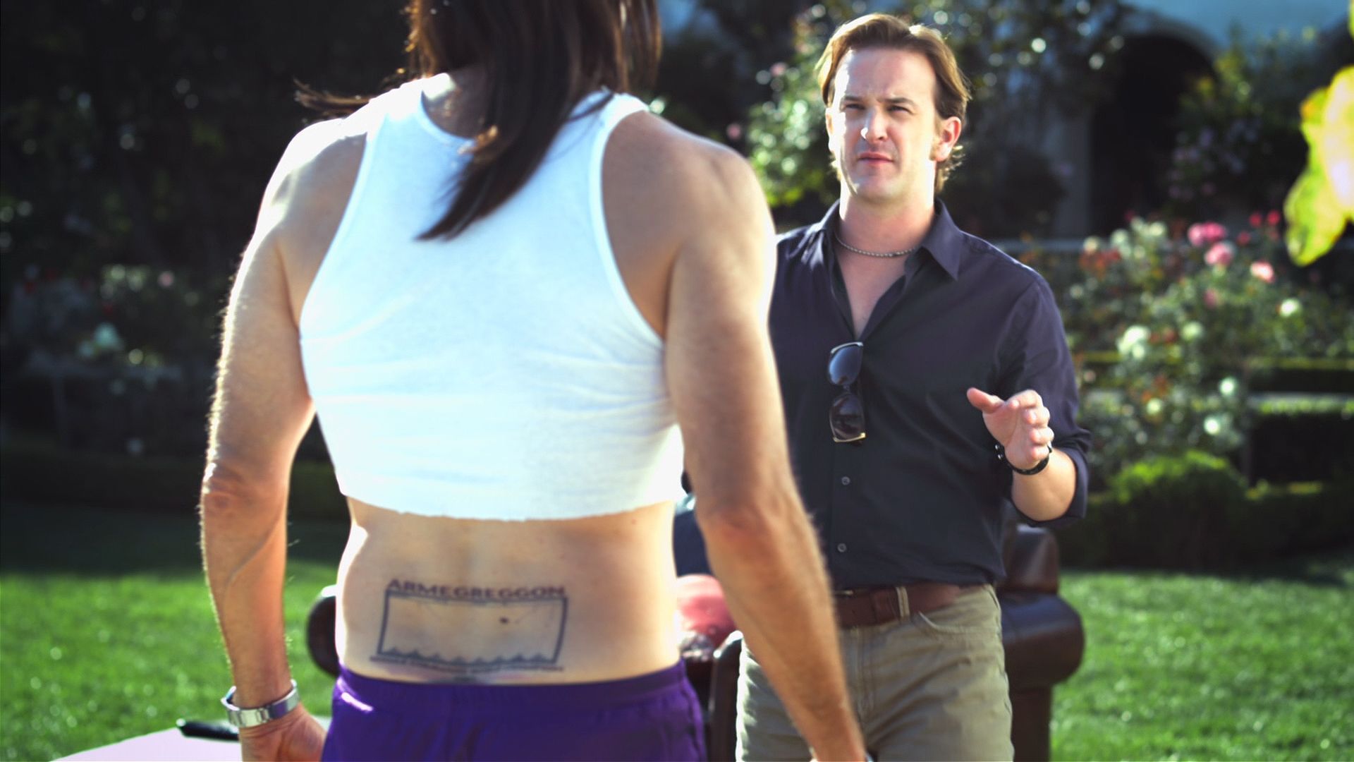 Noobz is an attempt to create an edgy comedy akin to Adam Sandler in his prime. Sadly it lacks the comedic timing, the writing and the production values to pull off such a feat. In the screenshot above you can see the pathetic attempt to add sex appeal to a movie by hastily taking a pair of scissors to the poor actress' tanktop. It's not even a clean line!
