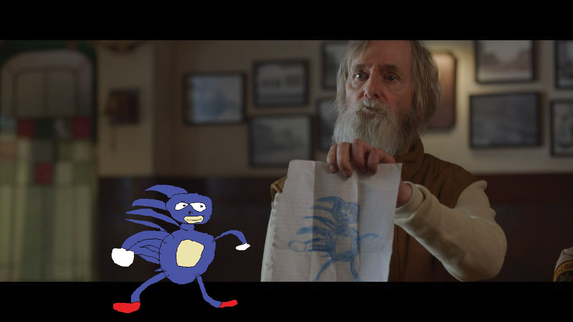 In another deleted scene, the crazy guy goes into the local bar and tries to tell Donut Lord about the blue devil. He draws a picture of the beast and shows it to him. This drawing happens to be an infamous fanart known as Sanic in an absurd but fun reference to Sonic fandom.