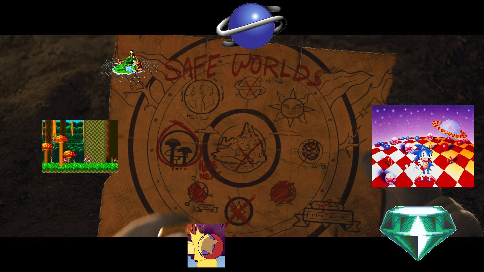 Sonic's map is also laced with Easter Eggs. The topmost world is an early design drawing of the Sega Saturn logo. The checkerboard world is a clear reference to Sonic the Hedgehog 3 and Sonic & Knuckles' special stages. The Master Emerald is in the bottom-right. There's a bumper at the bottom, and Mushroom Hill is clearly the inspiration behind the mushroom planet. I recognise the sun design, but I can't recall where from. The design of the island in the centre of the map is the South Island map from Sonic the Hedgehog 1 on the Master System.