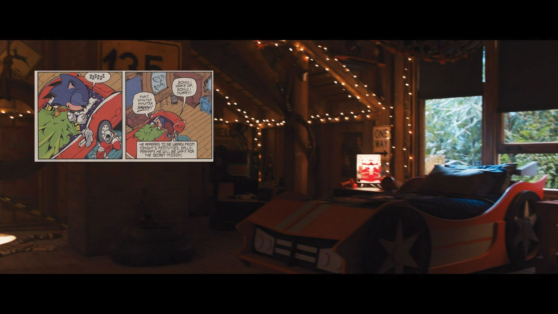 At the end, when Donut Lord moves Sonic into his attic, he has a sports car bed. This is very reminiscent of his sports car bed from the Archie comics. See our Knuckles Easter Eggs list to see how they adapted Tails and Knuckles' beds.