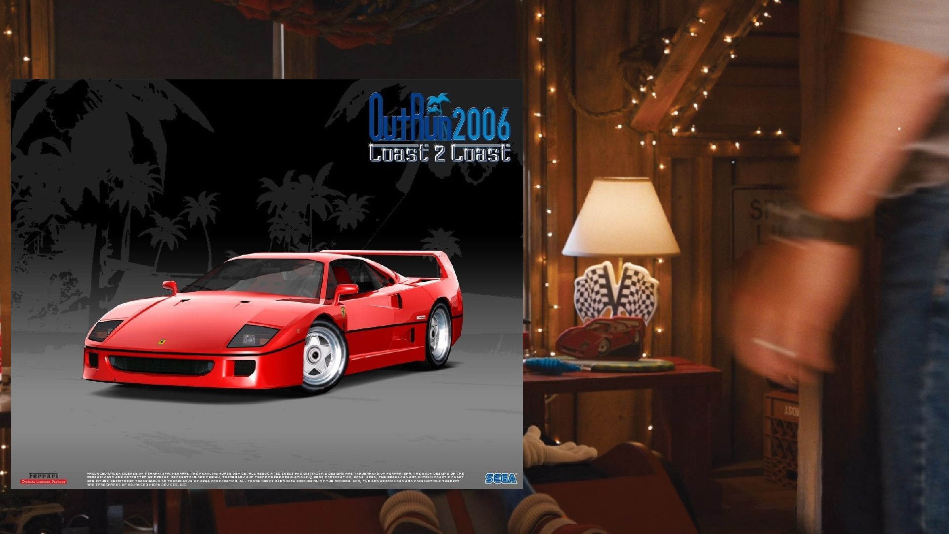 Sonic's bedside table has a Ferrari F40 decor. I'm fairly certain this image is actually a promotional render from Outrun 2, but I was unable to locate the exact image. However the F40 was the promotional car for all Outrun 2 artworks.