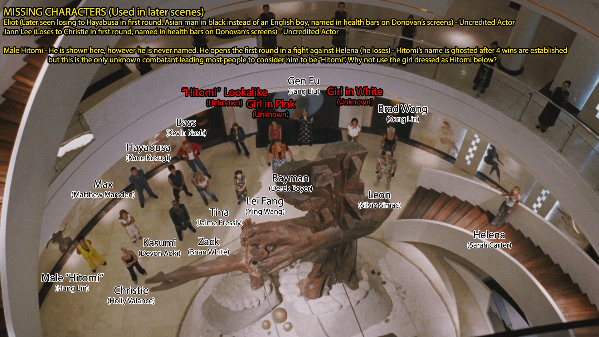 The first clear shot that she appears in (Though the back of her head and jacket is visible on the plane and in a reverse mid-shot prior) is the same as the Man in Yellow. Once the main characters arrive at Donovan's compound, Helena leads them all to the main atrium and Donovan walks out to greet them, talking to them from several stories up. We get a brief camera shot from Donovan's POV which apparently shows all of the fighters who made it to the compound before sundown (Anyone not there by that time is disqualified). For simplicity's sake, I've named all the known characters (under their given names in the film) and credited actors in the image to try and make sense of the mess.