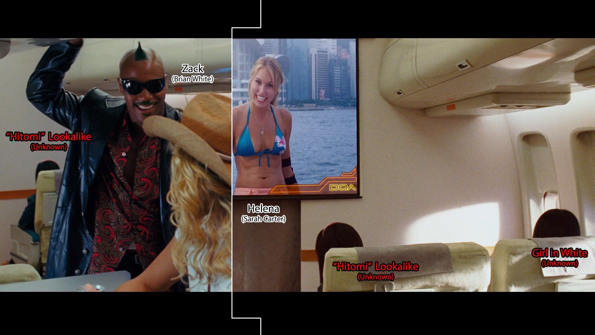 Of interest to my current theory - that some characters were cut from the film as much as possible for unknown reasons - is the fact that the plane scene includes a lot of characters teleporting from place to place. The Girl in Pink actually teleports from in front of Christie (in the seat next to Zack she has occupied almost the entire scene - bar his close up) to behind her within a quick few shots. Bayman, Christie, Hayabusa, the Girl in Pink, Tina and Bass all have moments where they teleport from one position to another - the most egregious being Hayabusa who just moves from his seat, to Bayman's, back to his multiple times - with nary a second between transport.