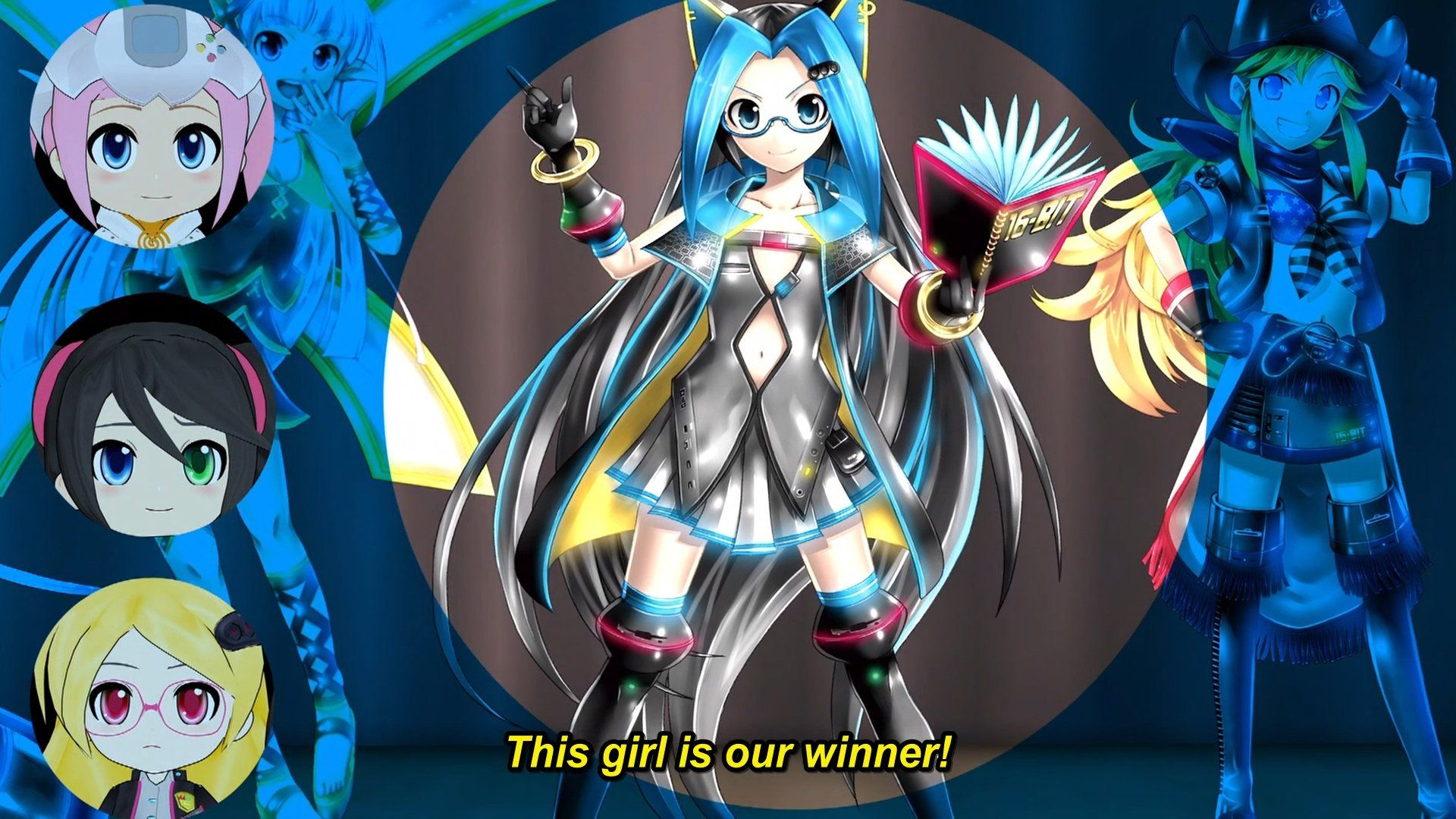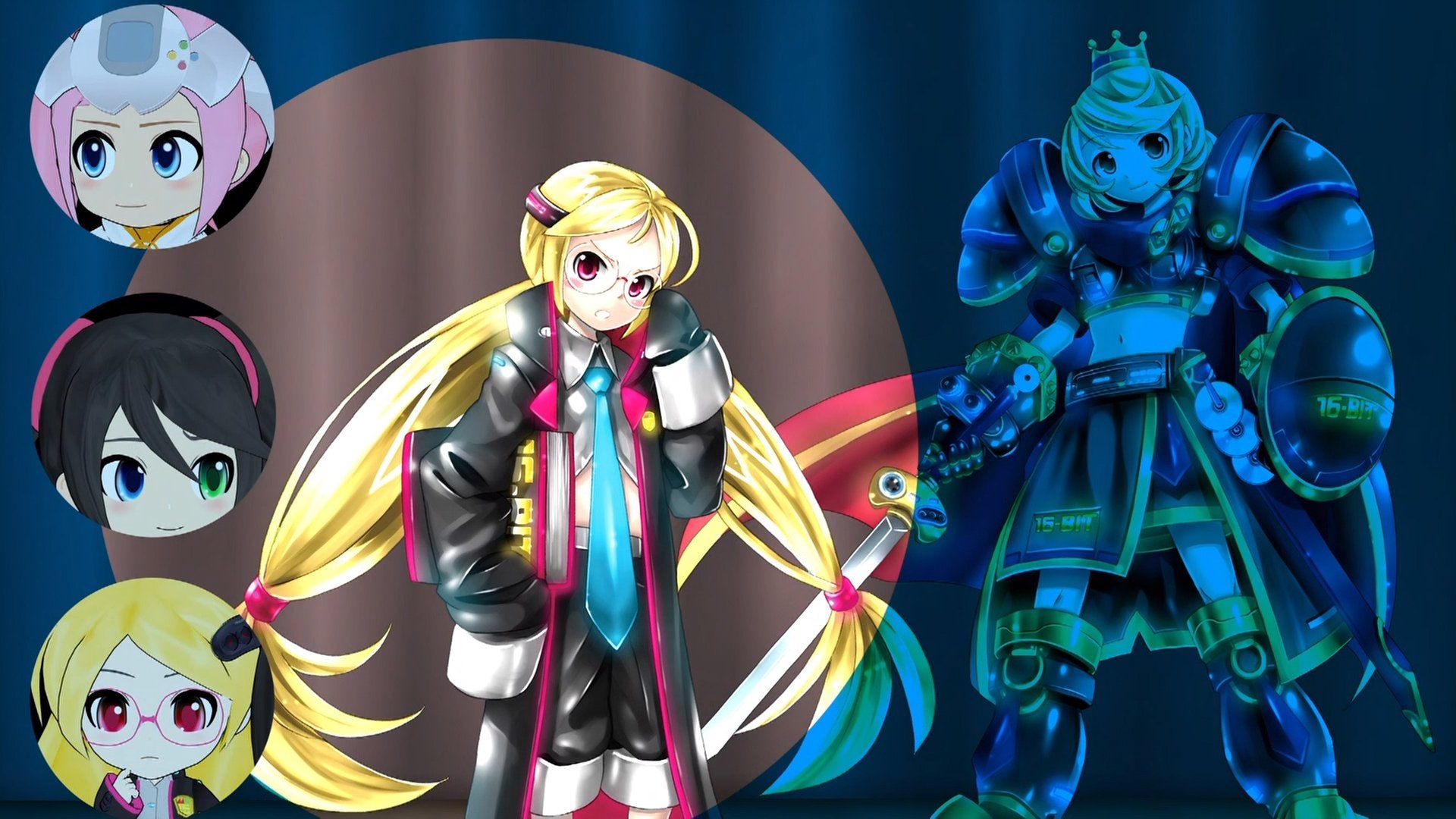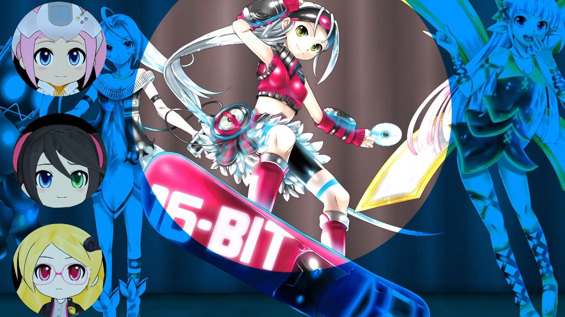 The character design incorporates the 16-BIT text by adding them onto an encyclopaedia the character uses. She has the three button controller as a hairpin, with the Japanese logo on a badge on her outfit (giving it the appearance of a uniform - fitting for a character so studious). This three button motif is also visible on her shoes and the sleeves of her jacket.