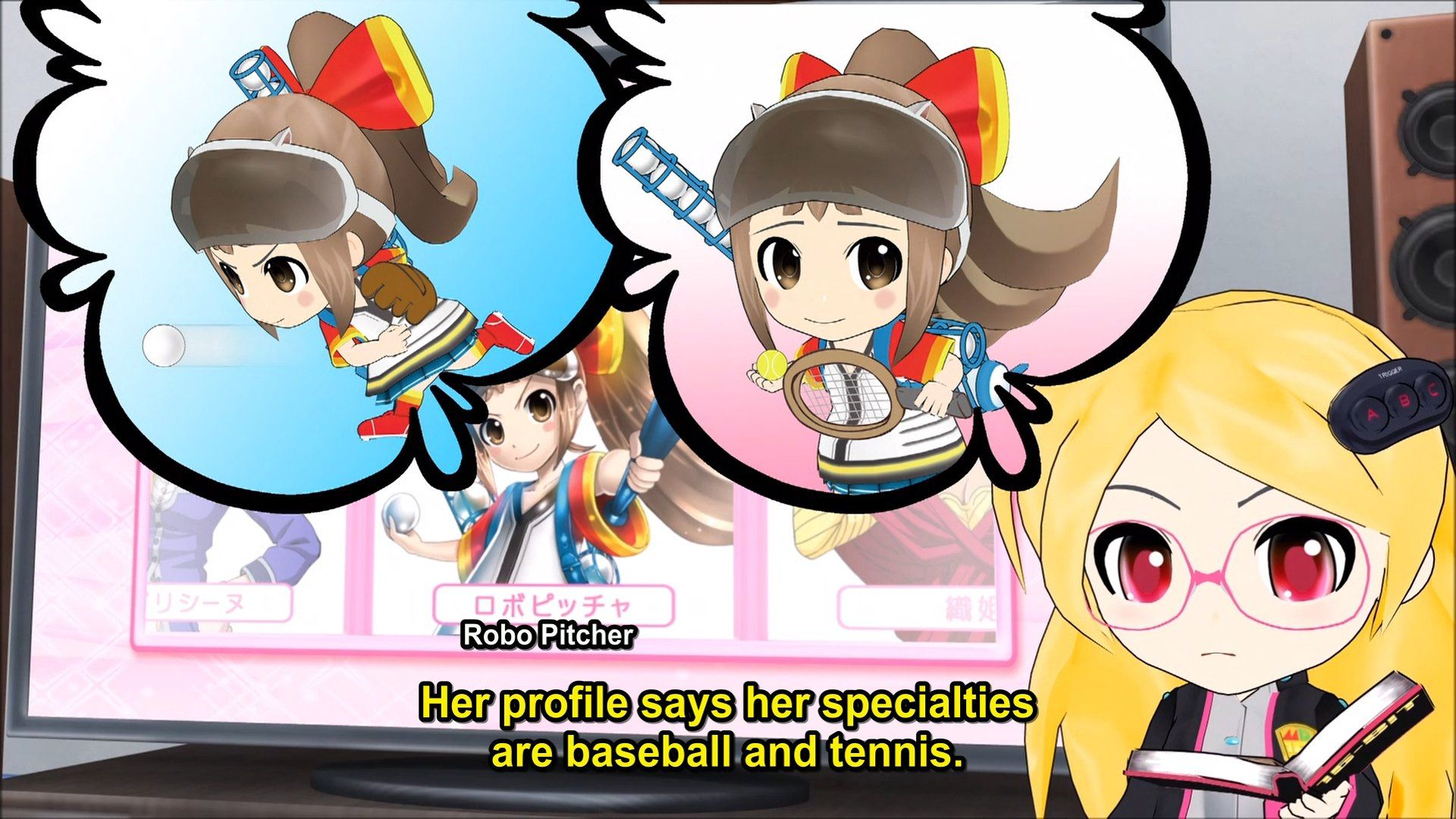 The character design incorporates the spaceman-esque visor ontoher forehead as a pair of shades, with the ball-loader strapped to her back with balls ready to access. Her colours match the white of the unit and the colours on the front sticker. She got three pre-posed images in Episode 8 as the girls discuss her chances in the Lovely Girl competition.