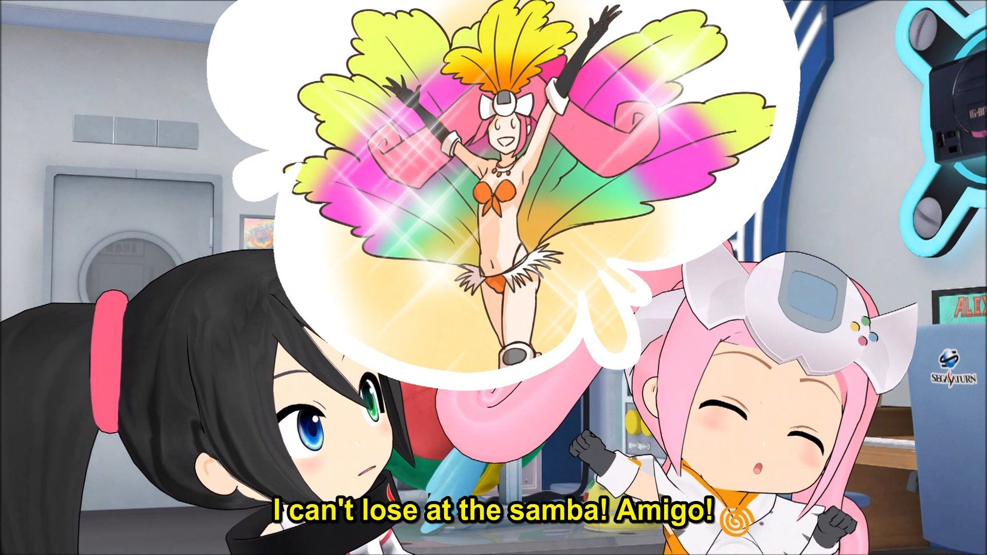 The first image, as seen in it's subtitle, is a reference to Samba De Amigo - a Dreamcast rhythm title with a Mexican theme which came with Maraca accessories (more on this below). She even basically namedrops the game - "I can't lose at the samba! Amigo!"