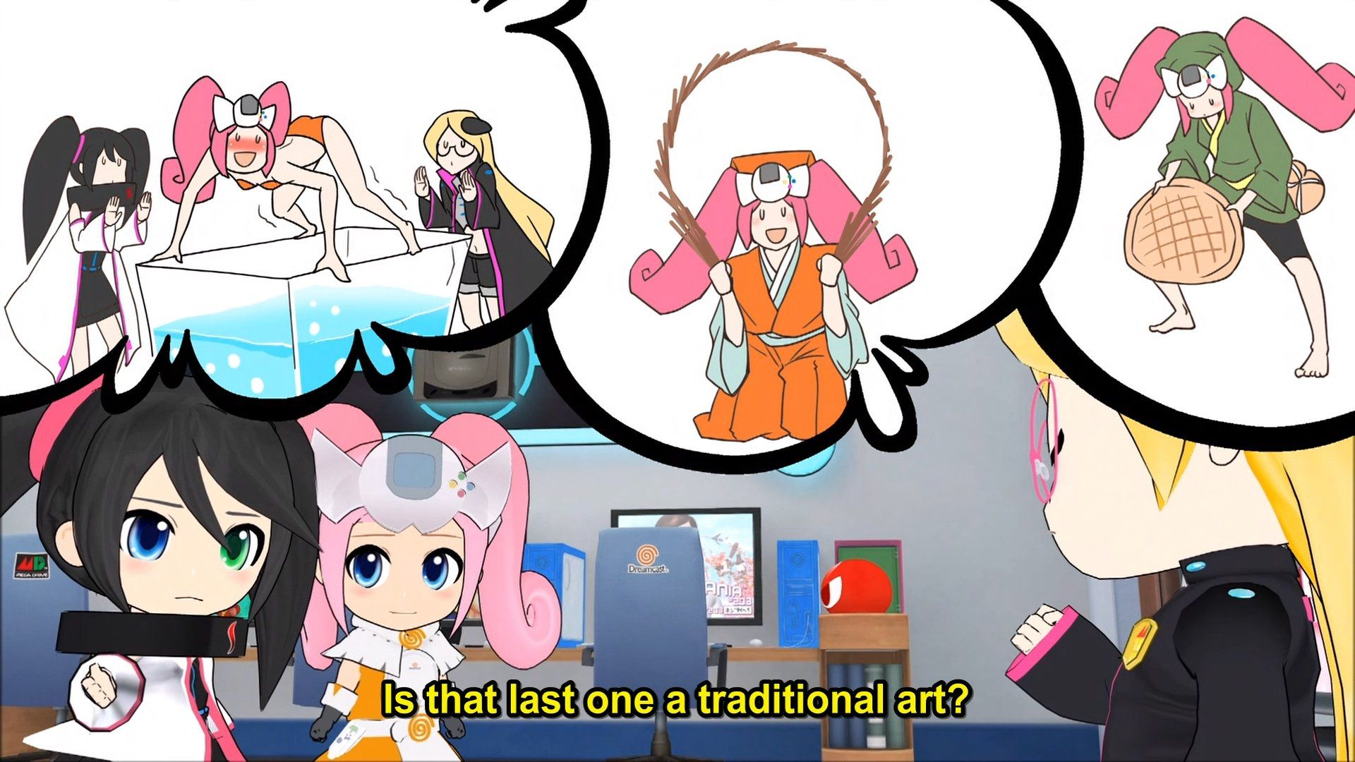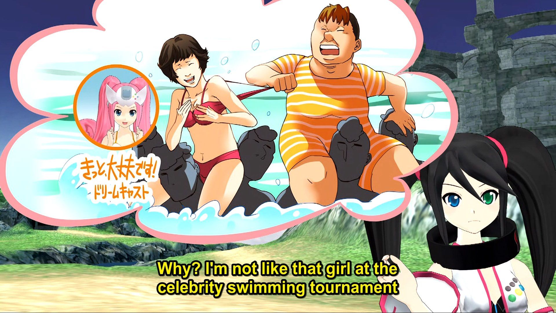 The other two pictures include her suggesting she'll do a traditional art at the Talent Show - but Mega Drive questions whether suspending herself above water in a bikini classifies as a traditional art. Also bear in mind that Japanese tradition is to read from right to left, which is why the "last" idea is on the leftmost side of the screen.