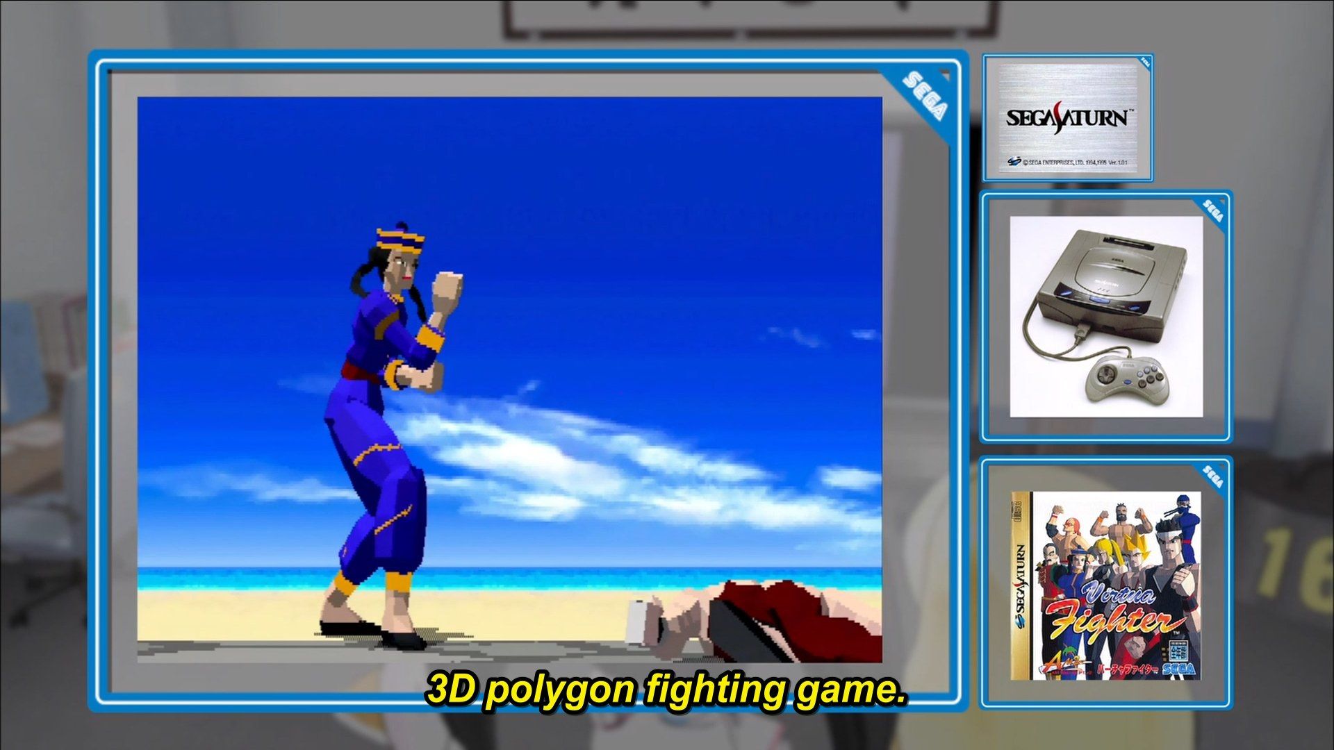 The final reference for this episode (since episode 1 mostly introduces us to the characters and Academy) is the info panels Center-Sensei uses to describe their first challenge inside of Virtua Fighter. He shows footage of Pai defeating Jacky in a fight.