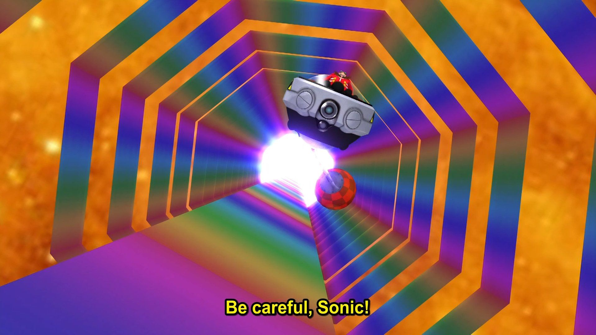 Episode 7 is largely the battle between Sonic and Robotnik, with very little else going on and few references. That being said, there's still several worthy of mention. The chibified girls all hang on to Sonic as he chases Robotnik through some kind of warp zone, and we get some brief shots of Sonic in Sonic the Hedgehog (1991) and the heads of the girls spinning whenever he hits loops or spins around.
