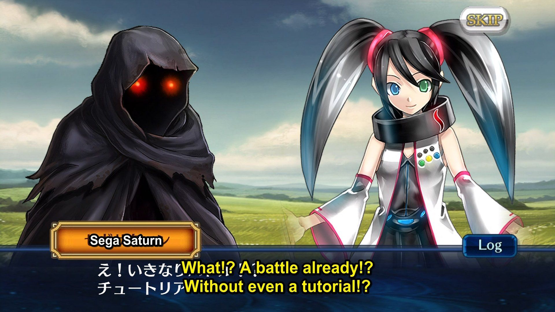 In the first shot we see the Sega Hard Girls chibi forms inside the Chain Chronicle world. This is also one of the few times we see Saturn's Twin Stick weapons in her chibi form.