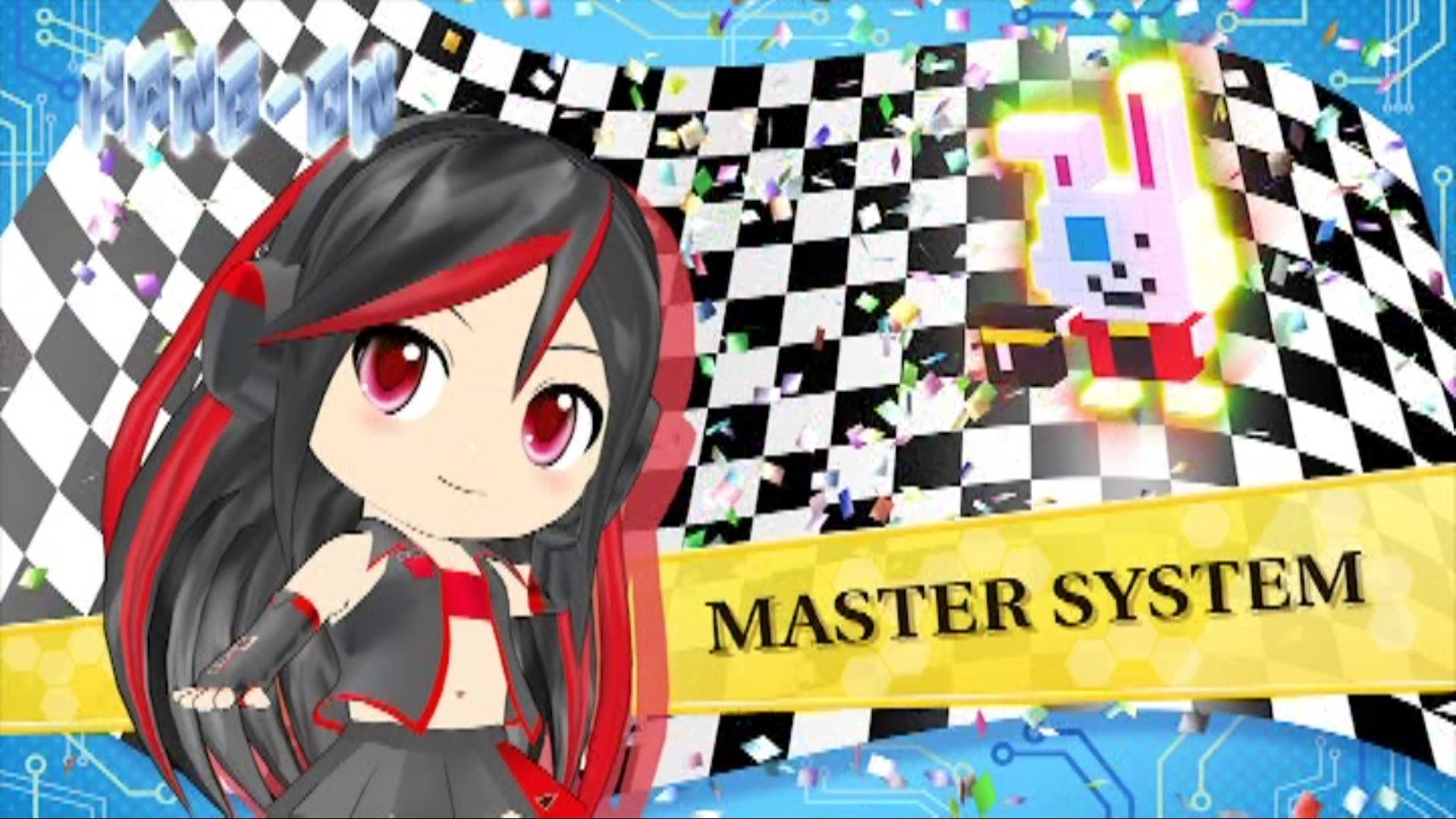 IMAGE 3: Master System - A young musical maestro in black and red. You can see elements of the Master System's exterior design on her skirt and versions of the controller are blended into the design of her gloves. In reality the Master System is actually just a Sega Mark III with a different exterior and a couple of additions built in. The Mark III had an optional FM Sound Unit that you could add, the Master System (in Japan) included this as standard - this meant that games programmed to use it wound up having far superior sound more akin to 16 bit machines than it's competition (the NES). The other addition (in Japan only) was a 3D Glasses port that allowed compatibility with 3D titles using the official glasses.