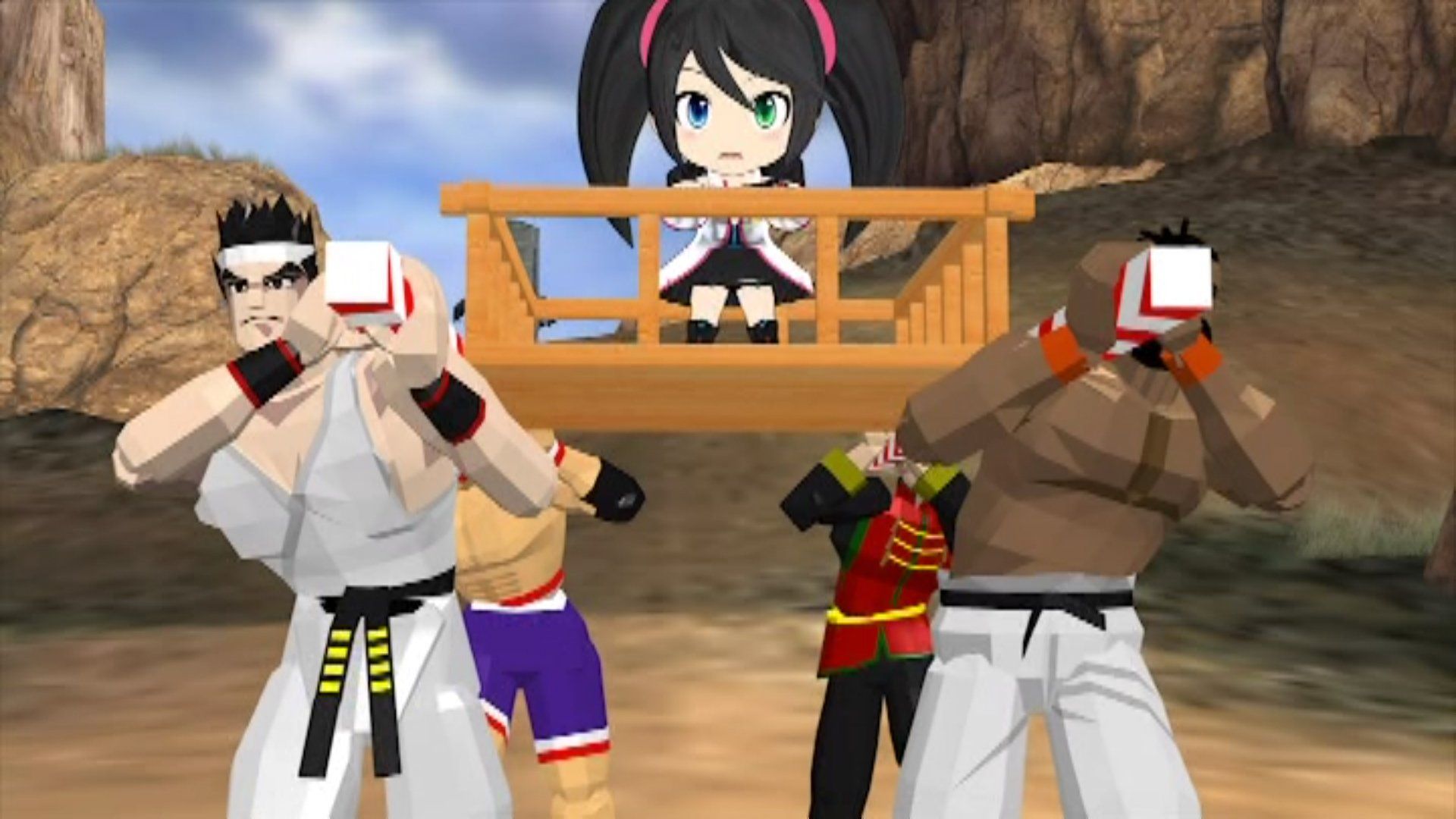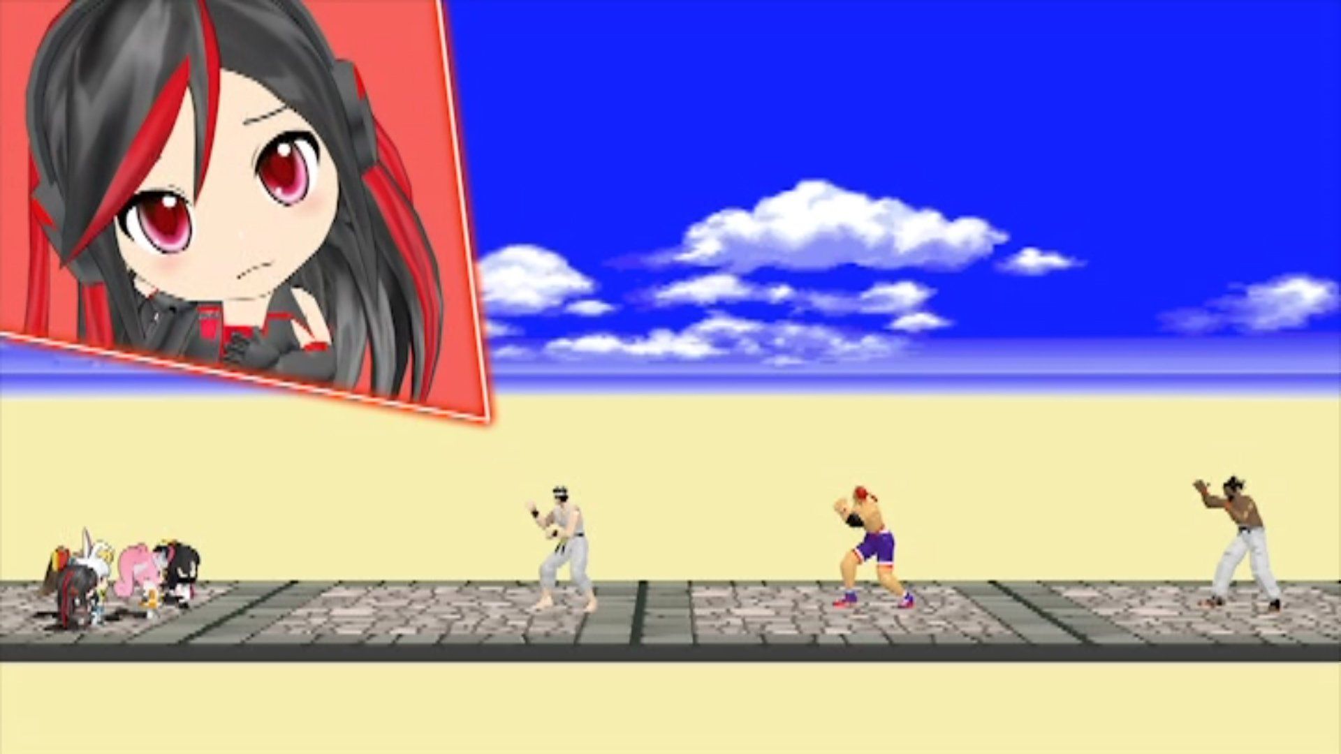 The first leg of the race includes the girls having to get past a 100 Man Kumite in Virtua Fighter. The girls push Saturn into fighting Akira while they run past everyone. Saturn reaches the end first anyway because Akira punches her across the arena.