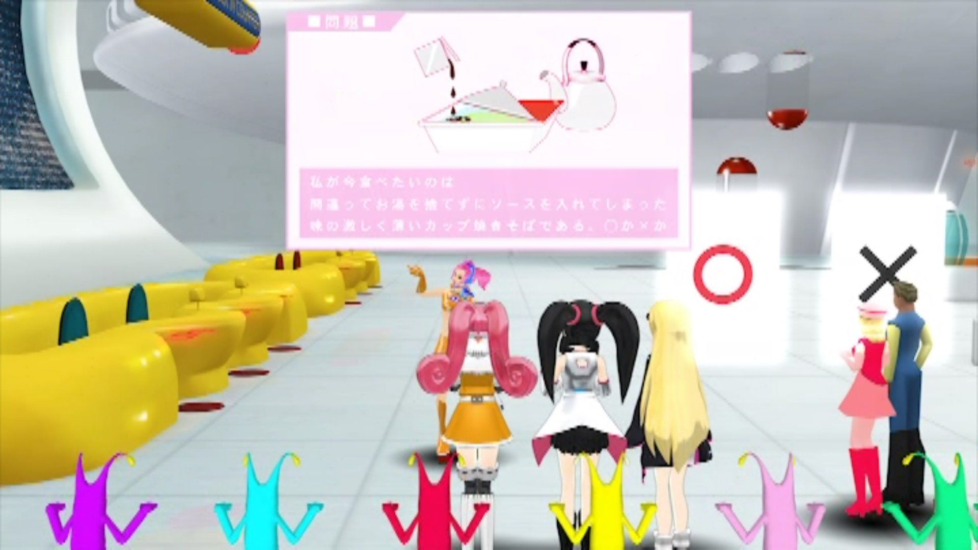 The second leg sees the girls return to Space Channel 5. Sadly (likely because they didn't have adult forms made) the 4 new girls don't appear in this sequence. Ulala asks the girls a True or False question on whether she is hungry for Yakisoba noodles. Dreamcast believes Ulala wants the noodles (and guesses correctly), whereas Saturn and Mega Drive believe Yakisoba noodles are too bland for Ulala and choose False.