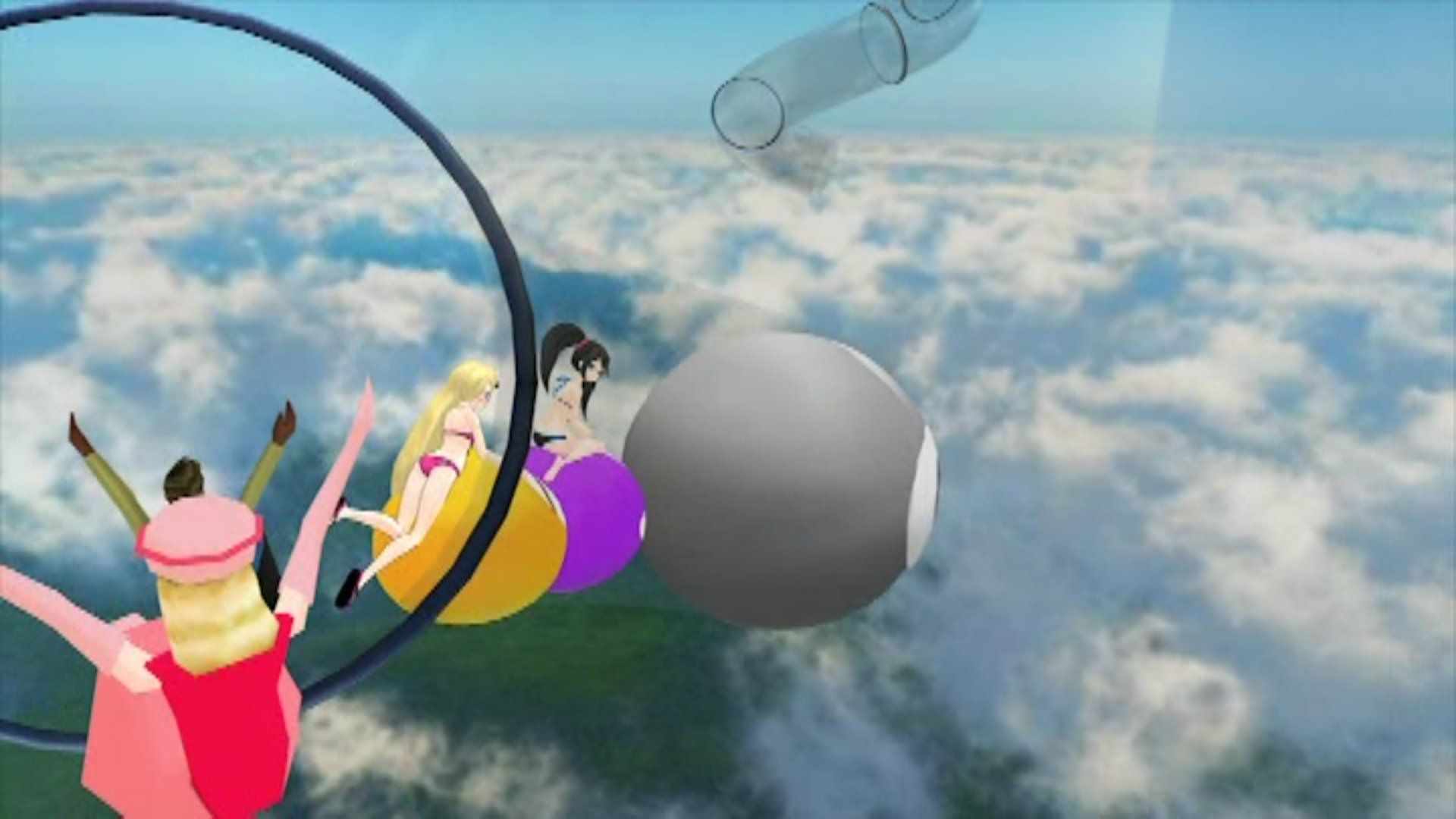 The third leg of the race sees the results of the girls' quiz answers, materialising in Puyo Puyo Waterslide. Dreamcast gets a smooth ride all the way down, while Saturn and Mega Drive get stuck in the pipe due to a grey Puyo. They're eventually popped into motion by other characters choosing wrong and hitting them from behind.